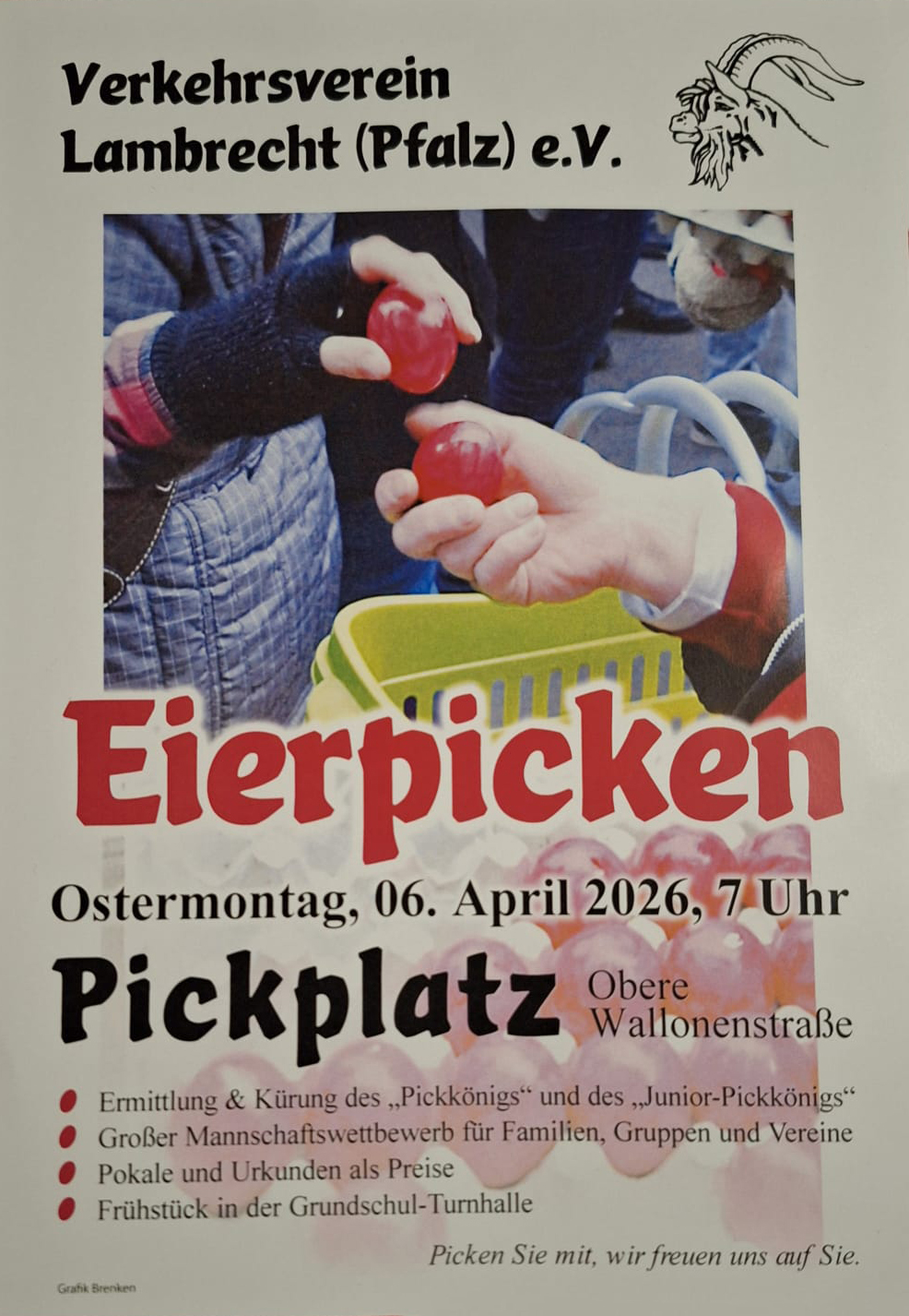 « Alle Veranstaltungen Historisches Eierpicken 6. April 2026 @ 7:00 « Osterrallye Infostand der Gemeindeschwester plus und des Pflegestützpunkts in Lambrecht » Zum Kalender hinzufügen Google Kalender iCalendar Outlook 365 Outlook Live Details Datum: 6. April 2026 Zeit: 7:00 Veranstaltungsort Pickplatz Walkstraße Lambrecht (Pfalz), 67466 Google Karte anzeigen Veranstalter Verkehrsverein Lambrecht (Pfalz) e.V.