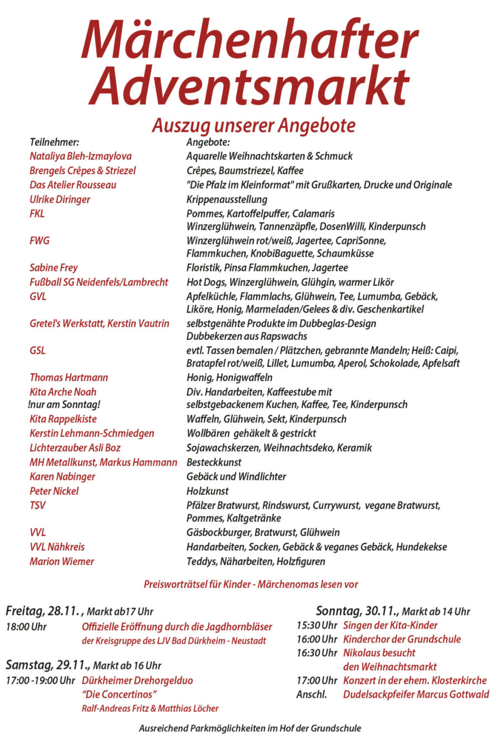 « Alle Veranstaltungen Märchenhafter Adventsmarkt 28. November 2025 - 30. November 2025 « Totenehrung und Gedenkfeier zum Volkstrauertag in Lambrecht PWV Wanderung » Zum Kalender hinzufügen Google Kalender iCalendar Outlook 365 Outlook Live Details Beginn: 28. November 2025 Ende: 30. November 2025 Veranstalter Stadt Lambrecht (Pfalz)